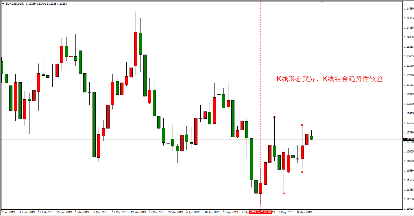 美元兑日元与以上两个品种不同,K线组合表现出明显的空头趋势行情,但依旧属于毛刺类行情。图中有红色叉号的K线,其影线占比过高,且相邻两根K线之间的重合度过高,形成下跌反复的特征,建议观望。