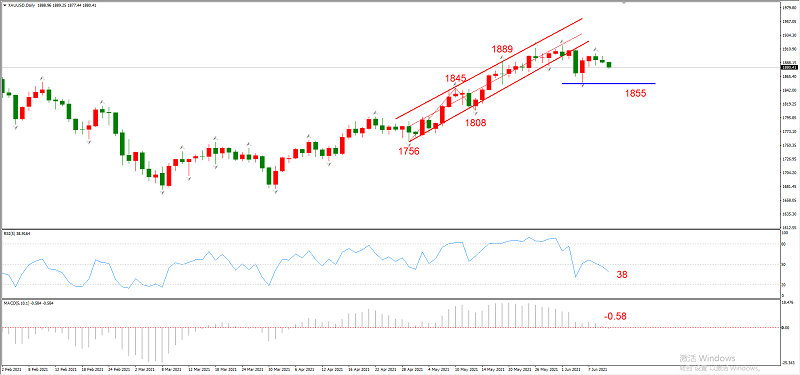 综合判断:黄金和欧元的技术走势相似,都是在突破通道线后,形成一个底部支撑。黄金的支撑位1855,如果今日能够下破该位置,则下跌空间打开。