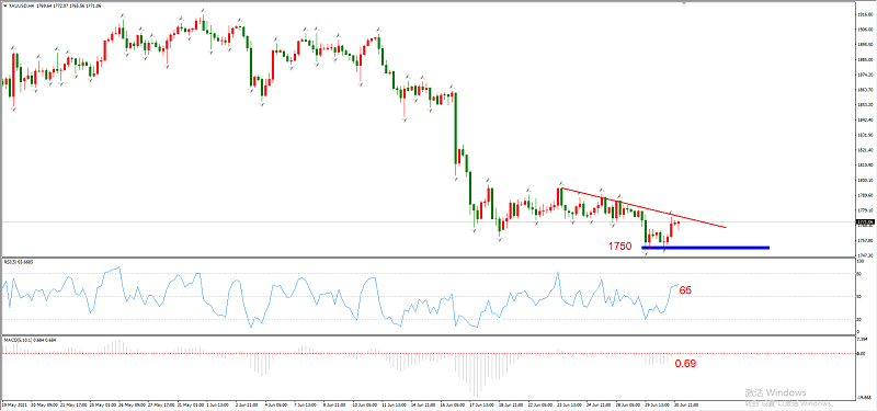 短线技术面:趋势依旧为空头,昨日跌破短期支撑位1760后强烈反弹,最新支撑位在1750位置。由于明日有非农就业报告,预计今日将会温和波动。