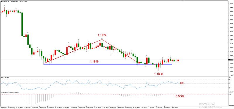 短线技术面:低位震荡,两个指标没有给出明确多空信号。走势结构来看,1.1846附近形成强支撑,上周五非农并未实现有效下破,预计本周整体将出现反弹,今日大概率维持震荡。