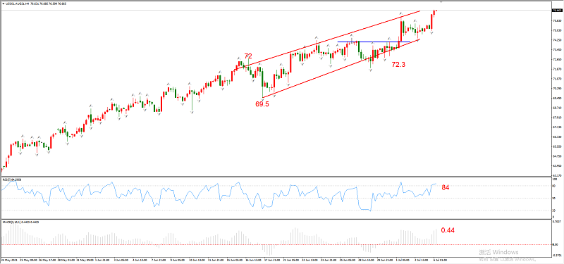 图3,USOIL 2021年8月合约,07月06日 H4周期