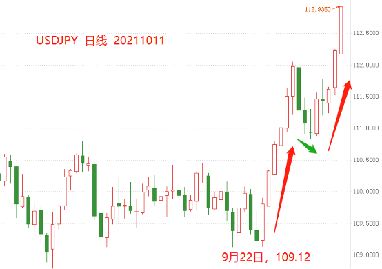 9月29日,日本前外务大臣岸田文雄当选自民党总裁,并按惯例成为日本新任首相(10月4日正式就任)。9月22日之前,USDJPY保持窄幅震荡走势;22日之后,飙涨模式开启。截至目前,USDJPY已经从最低点109.12,上涨至最高点112.92,涨幅3.39%,远超市场预期。