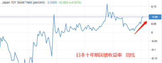 可以看出,日本的债券收益率在快速上升,年底前有望突破前期高点0.1650%(当前市价0.09%)。不过,美国的十年期国债收益率同样在上升,且绝对值较日本债券高得多,故而会导致USDJPY出现飙涨。
