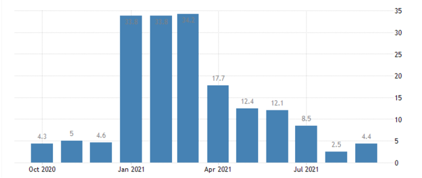 2021年9月中国零售贸易同比增长 4.4%,前一个月增长 2.5%,超出市场预期的 3.3%,原因是部分地区疫情得到控制后消费增强。期内, 家具(3.4% 对 6.7%)和建筑材料(13.3% 对 13.5%)均录得轻微。 其他项目如珠宝(8 月 20.1% 对 7.4%)、化妆品(3.9% 对平读数)、个人护理(0.5% 对 -0.2%)、电信(22.8% 对 -14.9%)、家用电器( 6.6% 对 -5.0%)、。 相比之下,服装(-4.8% 对 -6%)和汽车(-11.8% 对 -7.4%)的销售额均下降。