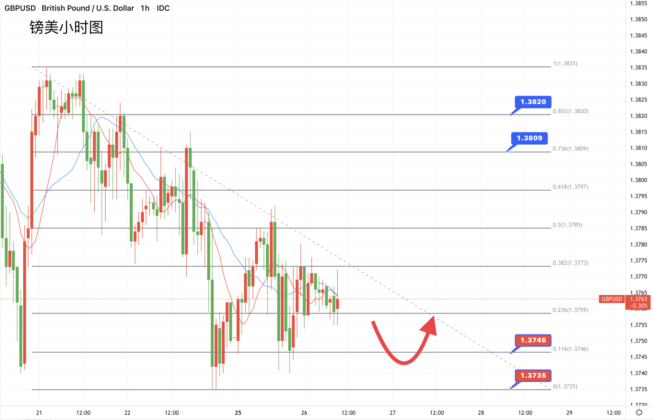 尽管美元向上但英镑兑美元仍自一周低位回升,技术上测试10日均线后获得反弹动能,继续关注美元走势及日内英国零售销售相关数据指引,如果可以延续反弹那么1.3800关口在望,相反如果反弹乏力可能回到1.3750下方。