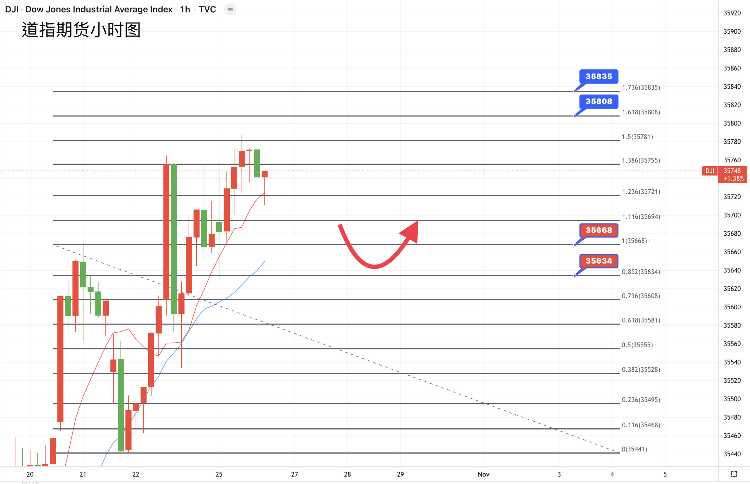 市场对本周各巨头的财报持乐观展望,道指期货今早延续升势再创纪录新高,站上了35800关口,但留意今晚美国消费者信心指数相关动态会否回落影响,如果道指整体升势扩大将指向35858/35888目标位。