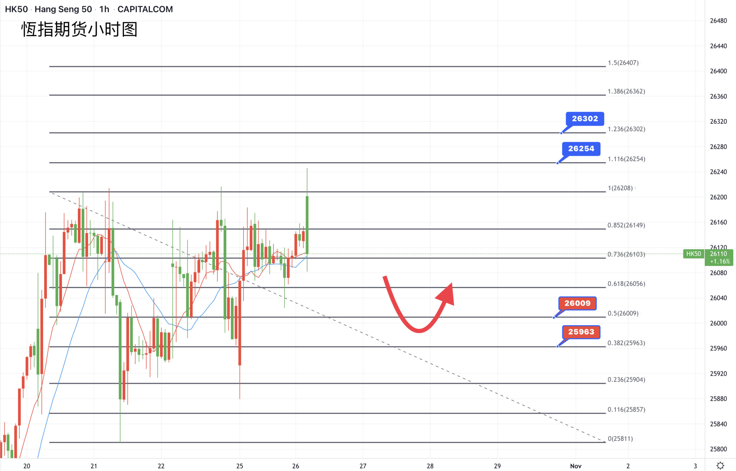 HK50昨日录得三日来的首次回升,但升势依然在自上周以来的区间高位止步,今早继续测试26200上方的高位,如果突破可吸引更多买盘跟进,但如果再次遇阻则留意下方的25940/25770支撑。