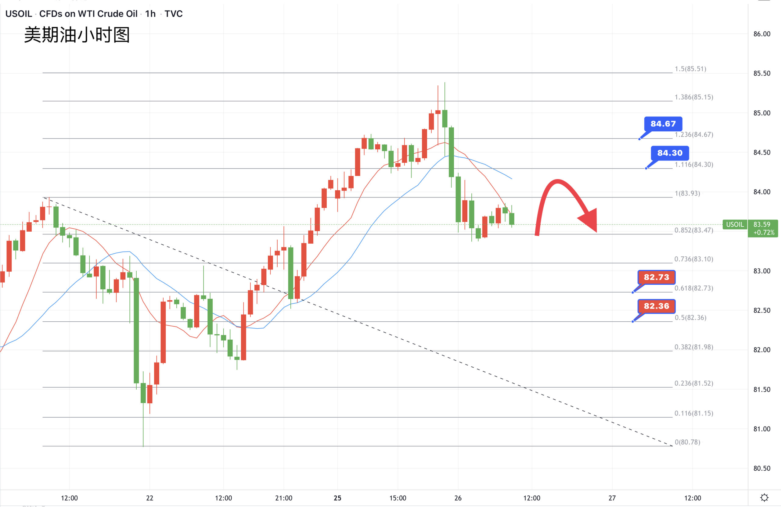 美油自2014年以来首次触及每桶85美元后回吐涨幅,显示该位作为重要的心理关口,市场在高位获利后短线可能还会有下行压力跟进,所以留意是否跌向83美元,而且消息面市场聚焦欧盟各国紧急能源峰会,看是否会采取措施应对油价的飙升,若有讨论成果,可能加大油价调整压力。