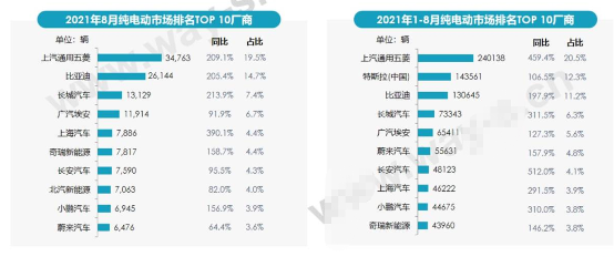 根据乘联会数据,今年1~8月份,新能源汽车销量排行: