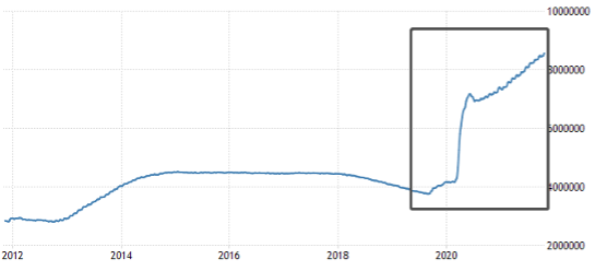 美联储最新的资产负债表总额为8.56万亿美元,这一数字在2020年之前还只有4万亿左右。从上图可以看出,美联储资产负债表在2020年7月份上涨趋势有所减缓,呈现出小波浪型的增长,但增速绝对值依旧偏高。在美联储执行缩减每月购债之后,上图曲线的倾角将大幅减小,到每月购债清零之后,曲线将拐头向下。逻辑上将,美联储资产负债表的降低,能够推动美元指数走强。所以,预计周四凌晨2:30左右,EURUSD、黄金等品种将出现一波短线下跌。