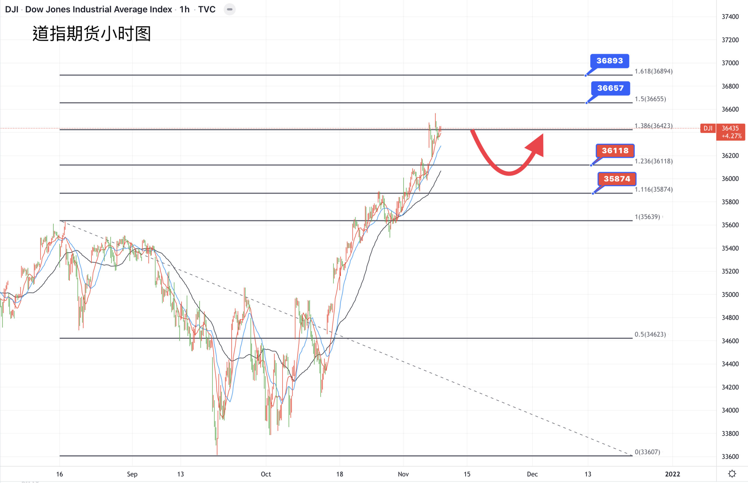 市场继续消化上周美联储和非农行情,氛围相对造好,道指期货昨日再创纪录新高,只是尾盘涨幅收窄,今早在36400上方略有调整,在观望周三美国CPI前,仍偏向高位的交投,更高目标在36500之上。