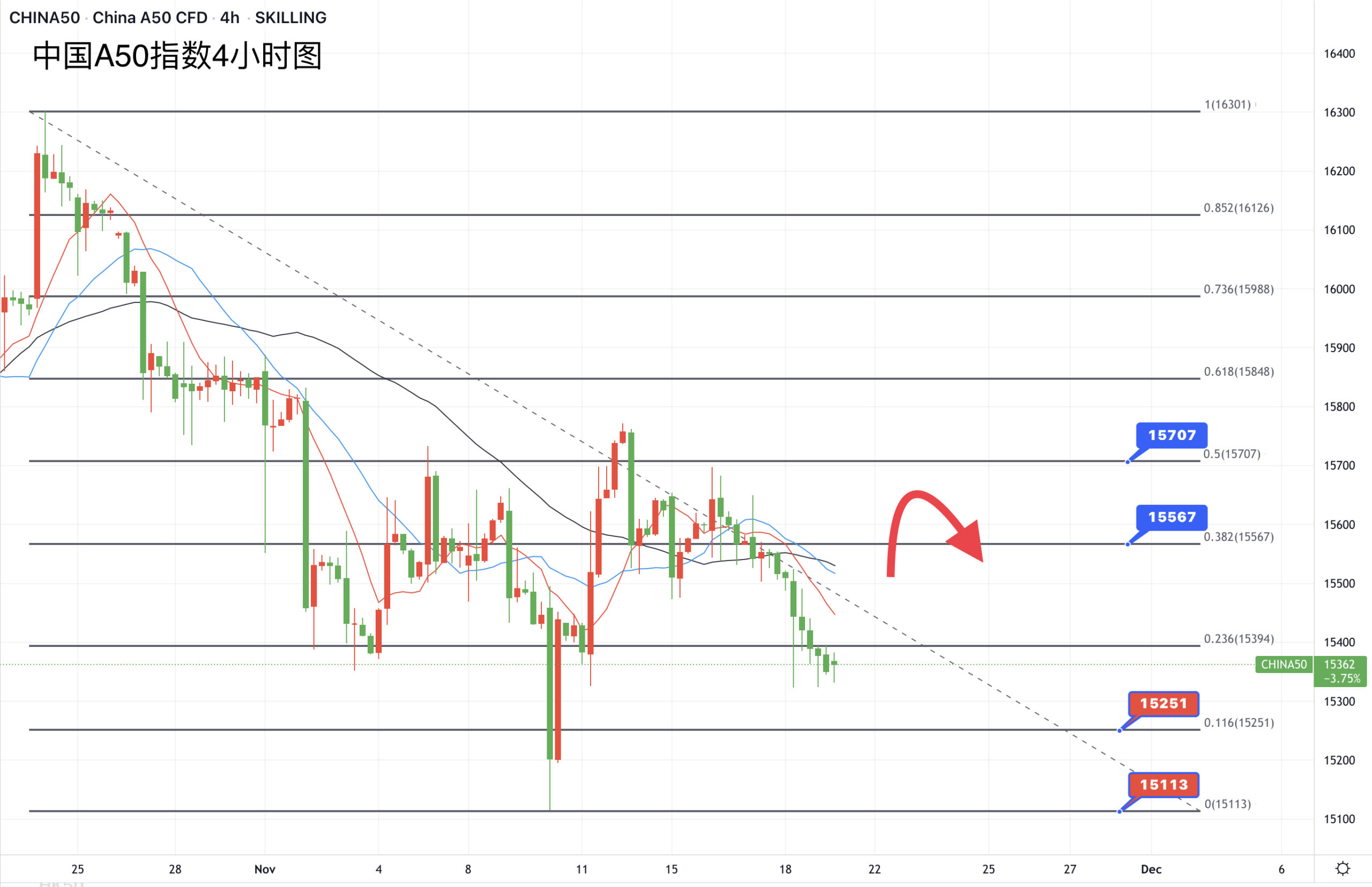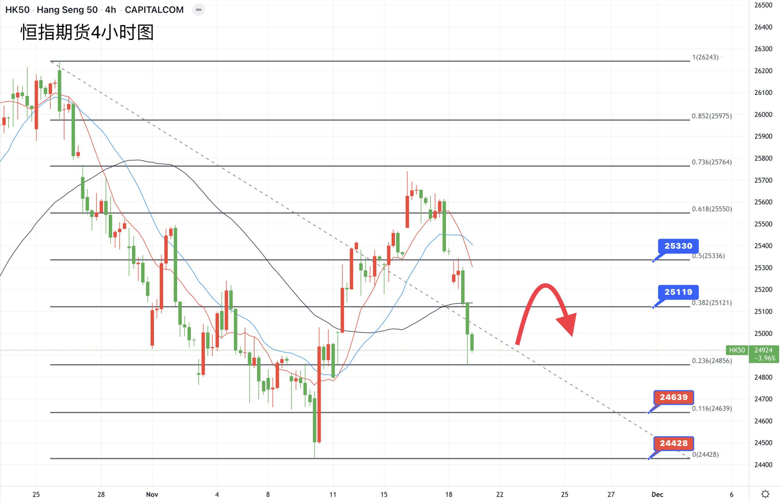 HK50昨日录得10月初以来的最大跌幅,留意隔夜中概股表现欠佳,阿里财报不及预期可能在日内继续拖累大盘表现,技术上价格也跌落均线下方,如果延续在25000关口下方的承压,可能指向24638/25428支撑。