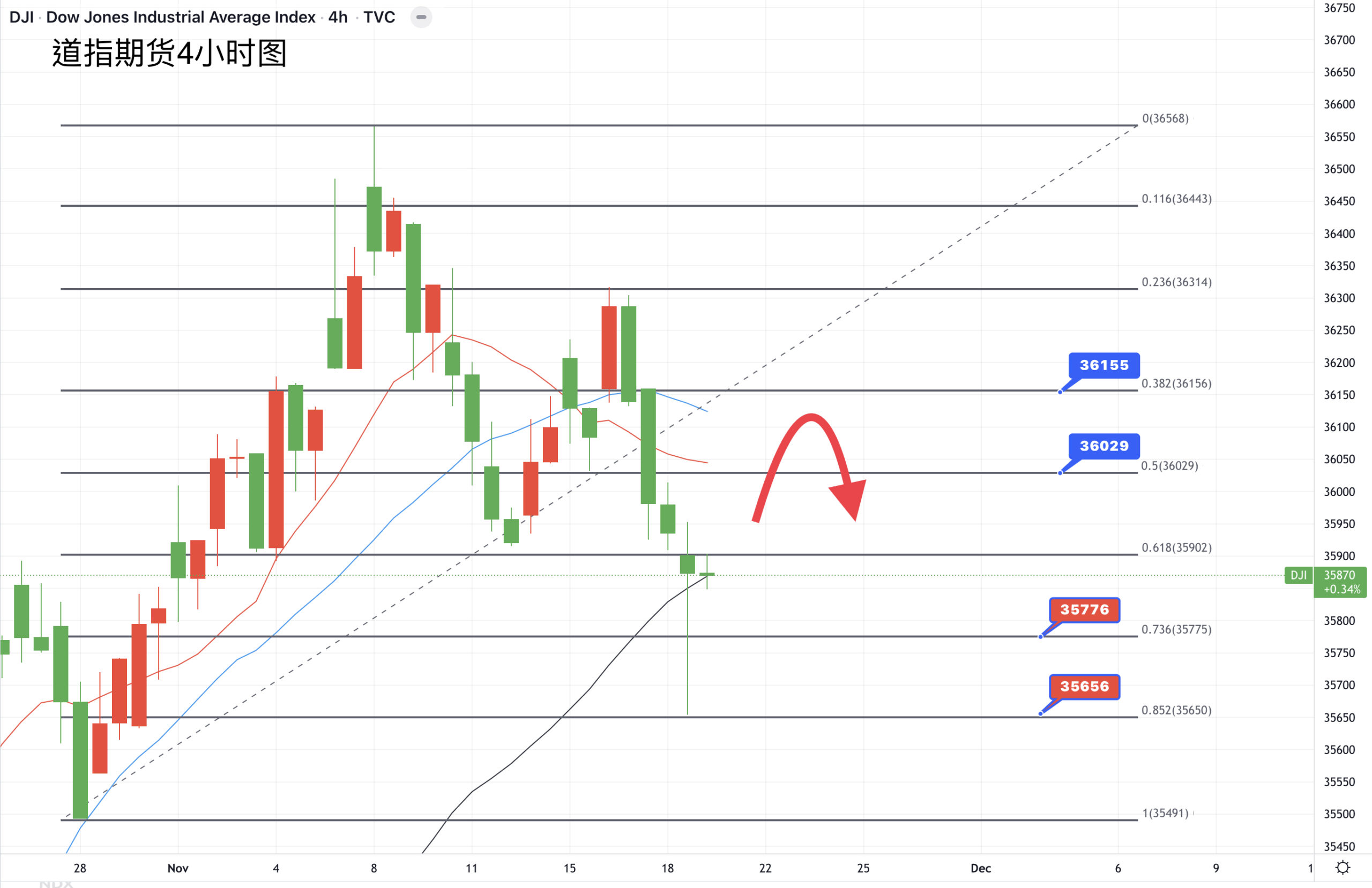 道指期货昨日未能跟随升势造好,盘中曾经录得10月底以来的新低,尾盘尽管回升但是未能守住36000关口,技术上测试了20日均线上方但遇阻,日内美国数据指引有限,继续看市场情绪是否延续改善,如果上涨首要阻力仍在36000关口附近,突破才能获得更大空间。