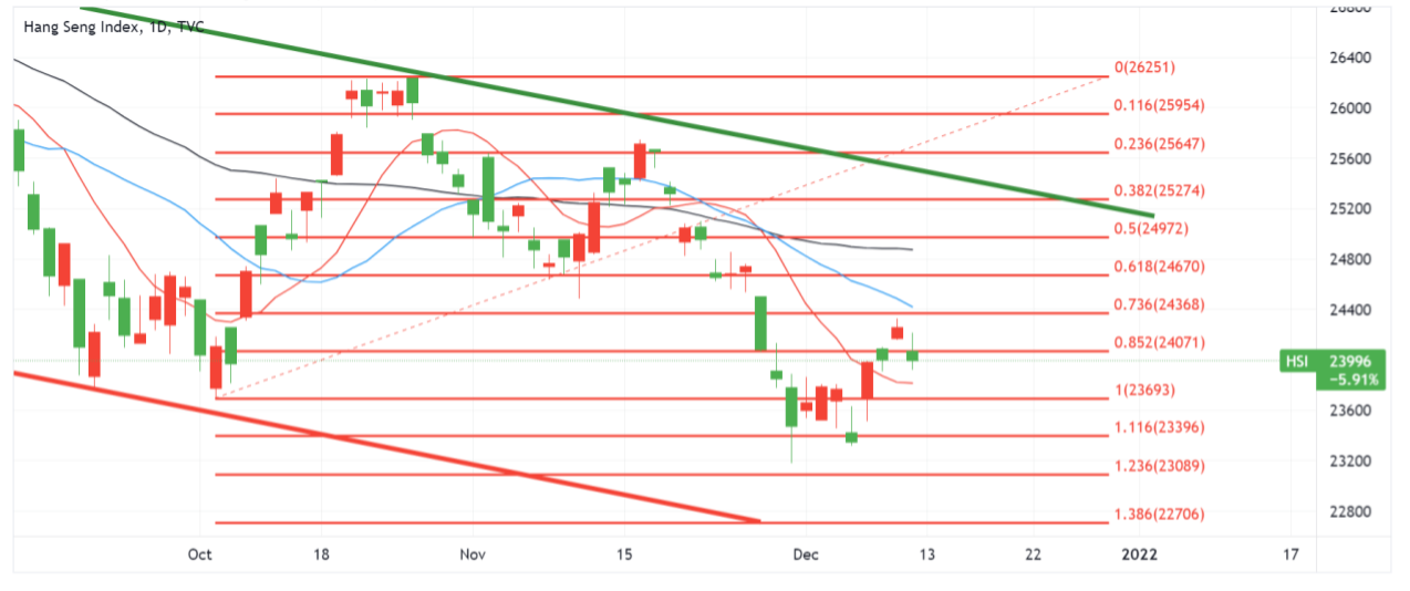 周五晚美国将公布11月通胀数据, 当中最受关注的通胀年率可能创40年高位, 结果前预测通胀数字为6.9%。这种预期使投资者在周五港股入市态度转趋审慎, 并且于高位出现沽盘出现。港股于周五开盘前一个多小时仍有买盘吸纳, 主要反映周四美国公布的就业经济理想, 恒生指数曾挑战周四高位, 但最终于未能触及已于24254位置出现回落, 收市前下跌逾300点, 跌1.29%。