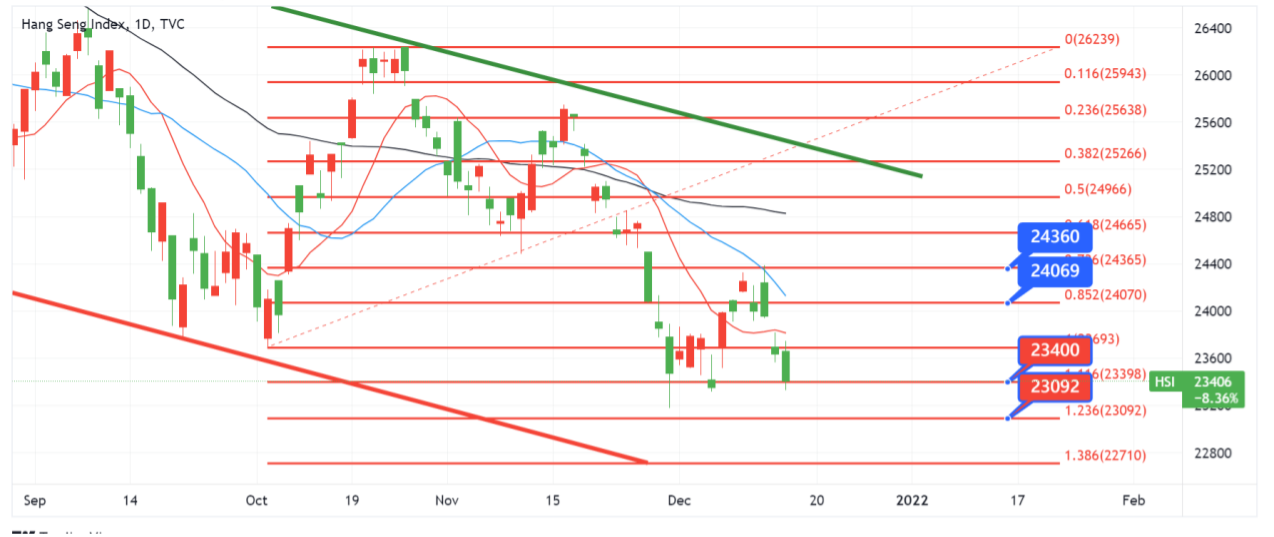 近期ATFX分析一直预计,恒生指数若下跌5%至7%幅度计算, 将会可跌下跌至22800至22320。而周一时估计在美联储政策会议发布前, 恒生指数将再一次下挫至初步的支撑23693或23395支撑, 周三恒生指数则曾低见23326后暂见支持力度。若美联储议息结果和展望温和, 投资者可以享受一个多月的蜜月期直至明年第一次美联储议息会议。预计恒生指数能反弹, 技术目标将估计靠近20日均线24400。若打破该阻力位限制, 下一步将上探25000。