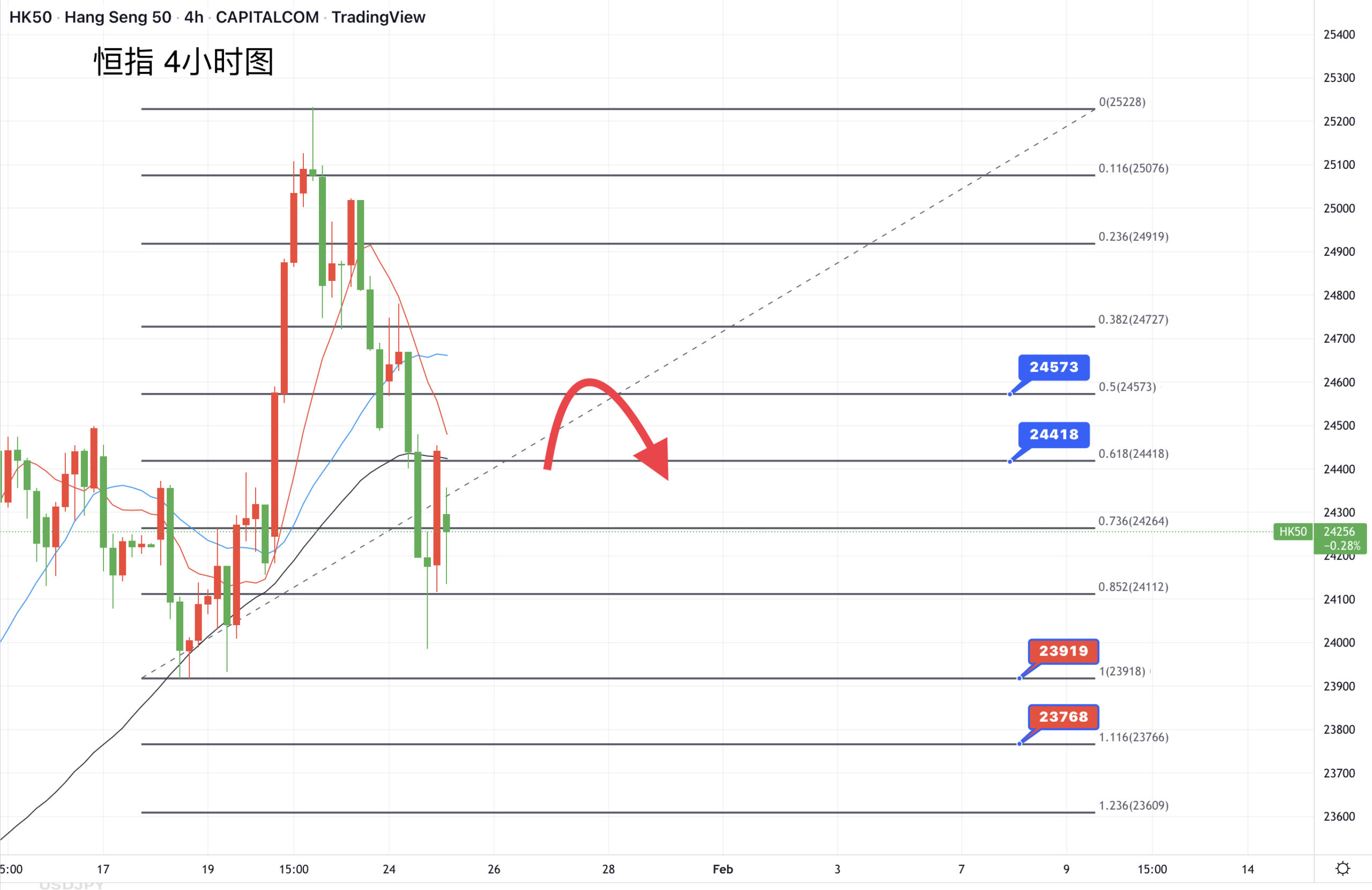 HK50昨日创去年11月以来最大跌幅,触及上周低位范围,并自1月初以来首次收低于10日均线,释放下行压力,所以看能否守住24000关口来决定走向,如果维持其上方仍可展望反弹。