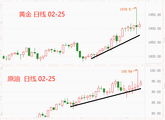 避险情绪:昨日,亚盘和欧盘时段,受俄乌战争影响,黄金、原油持续上涨,前者最高触及1976美元,后者触及100.54美元。但是,美盘时段,黄金和原油价格大幅回落,两者均收出长上影线,最终收盘价分别报在1905美元和93美元。从价格表现来看,北美洲交易者倾向于认为俄乌之间的战争会很快结束,双方将回到谈判桌上解决问题。或者说,美国和北约的克制态度,也就是不帮助乌克兰抵御俄罗斯,令市场避险情绪迅速回落,押注“北约和俄罗斯对抗”的多头提前获利了结。接下来的问题是,黄金和原油还能否回到昨日高点,俄乌冲突所激发的避险情绪真的已经消耗殆尽了吗?答案在后续的局势发展当中。关键点在于俄罗斯的意图,如果后续争夺仅限于乌克兰东部的顿巴斯地区(主要是顿涅茨克和卢甘斯克),那么避险情绪将很难被再次激发,黄金和原油也将按照供需层面的常态化逻辑运行。如果俄罗斯的意图是占领乌克兰全境,那么昨日的争夺仅仅是序章,避险情绪在短暂回落后还将迅速放大,届时黄金和原油还将迅速上涨,突破昨日高点应当不是难事。