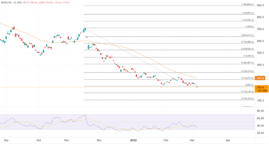 ATFX指出,自去年监管压力对科技股形成一系列冲击以来,在美股市场,B站市值已经蒸发了近3200亿元;股价在港股中也是跌幅靠前,今年至今已经跌逾40%,而同类股票今年累计跌幅为10%左右,如果跌破220港元的关键支撑,恐怕还要下试160港元。