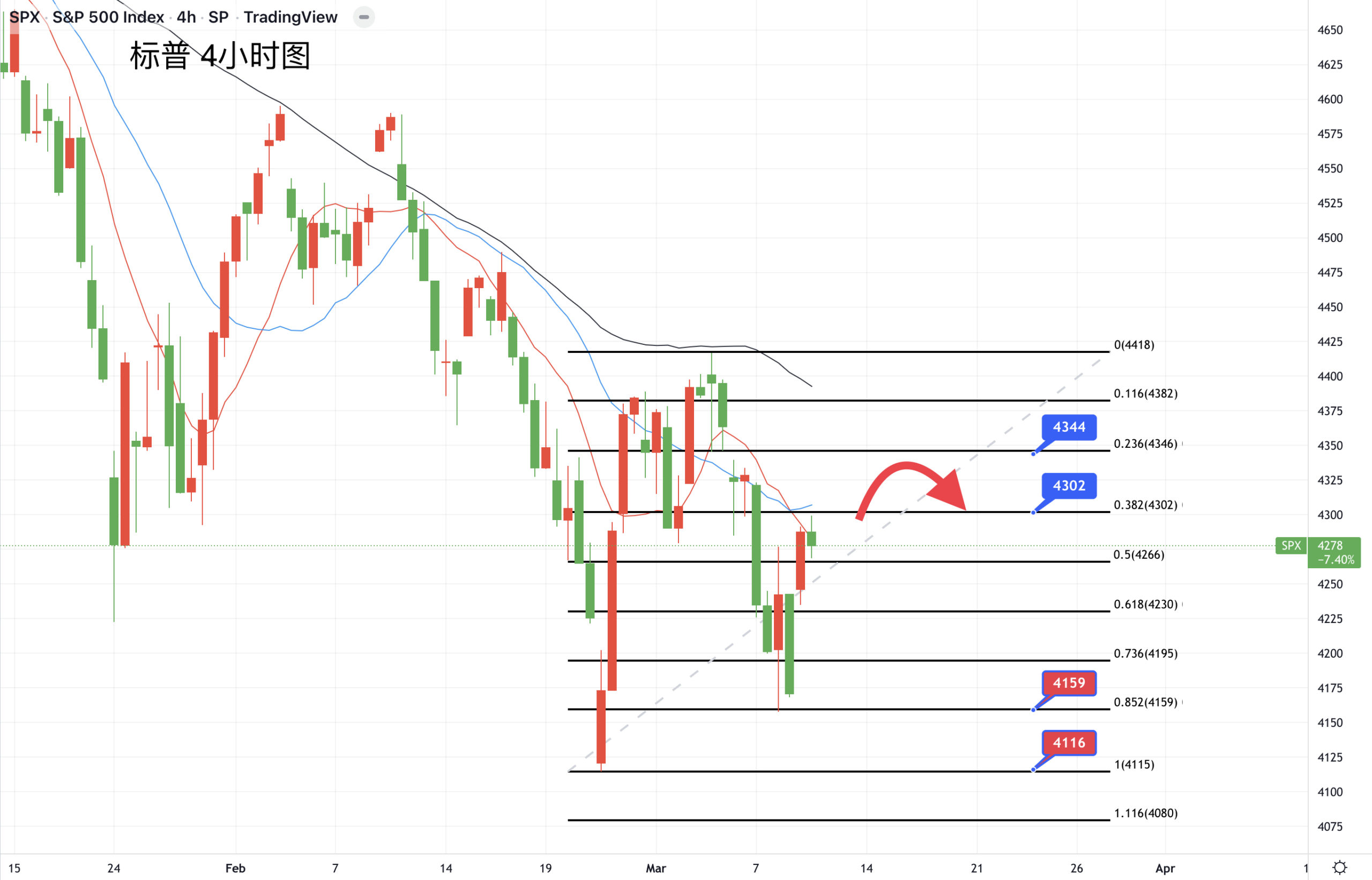 标普500指数上涨2.6%,止步四连跌,权值较重的科技股和金融股涨幅居前,能源版块重挫。技术上隔夜反弹在临近10日均线之前掉头,该位正好在4300关口,看今晚美国CPI数据能否提供更多指引。