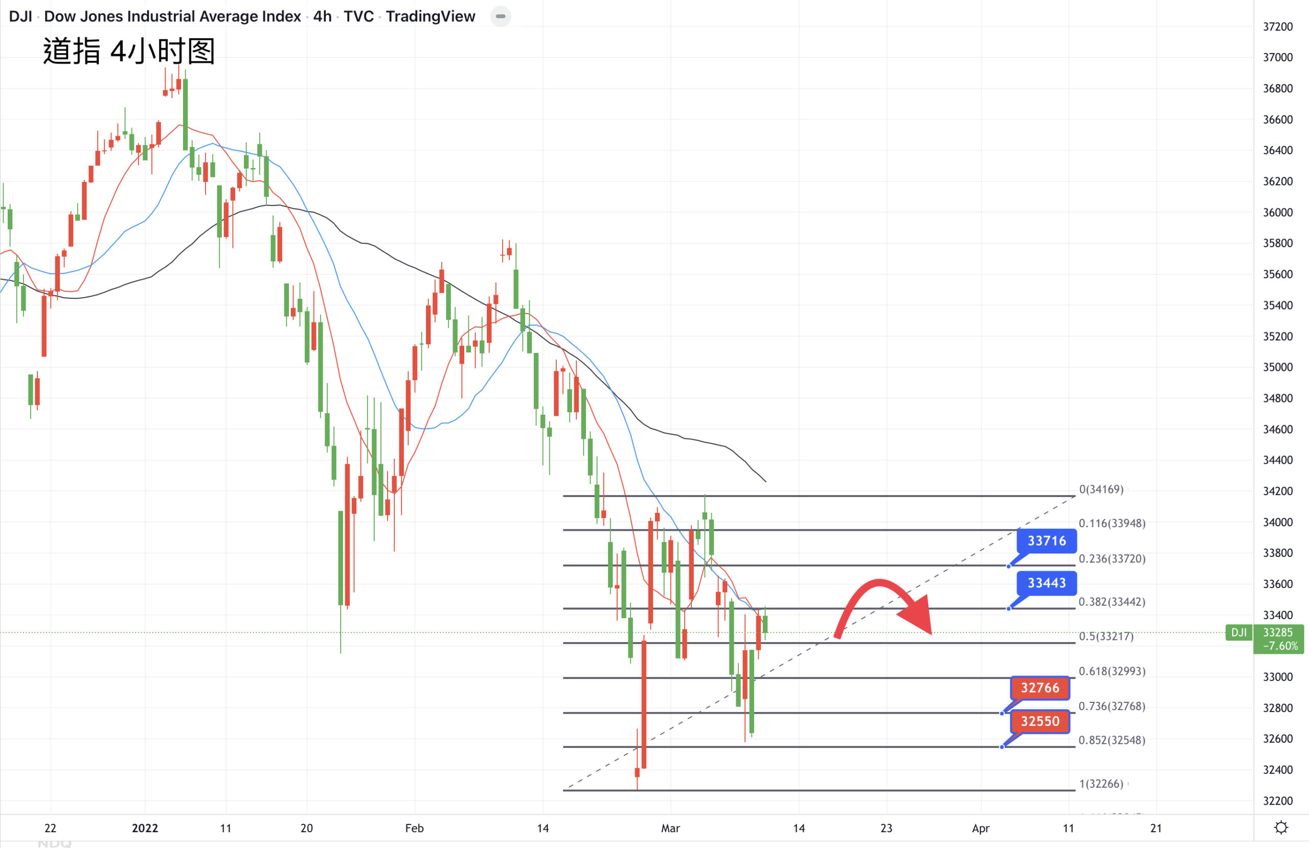 在最新俄乌局势发展中,隔夜美国股市强劲反弹,道指回升逾600点,回到33000关口之上,只是反弹在10日均线处遇阻后止步,除了最新局势外,今晚可以留意美国CPI公布是否超预期。