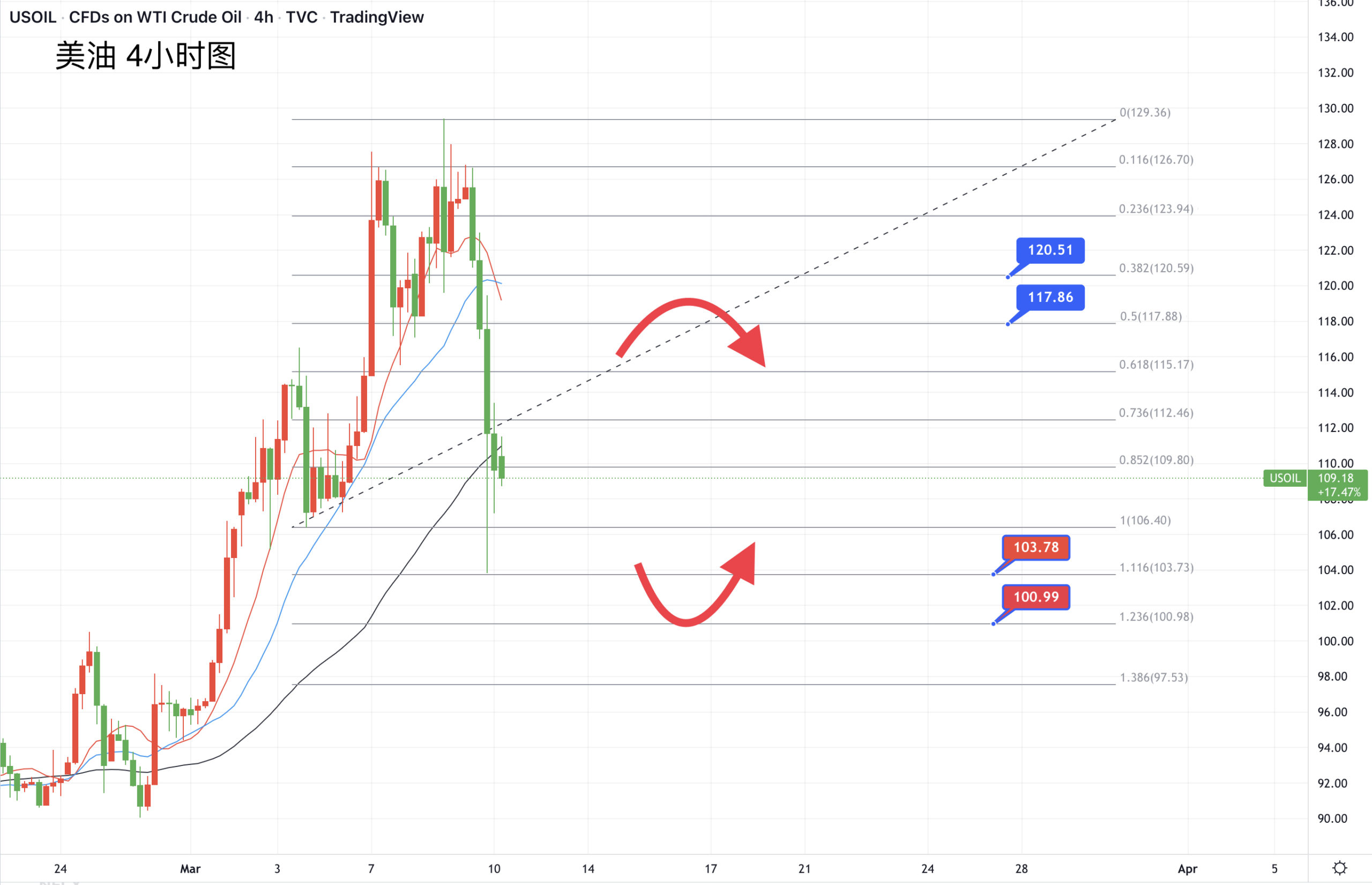 能源和大宗商品价格从近期高位重跌,市场看俄乌局势是否有转机,同时阿联酋表示支持向陷入混乱的市场增加供应。美油跌超15美元,为去年11月以来表现最糟糕的一天,盘中触及10日低位,当前盘整在110美元附近,预计经过隔夜大跌会有整理。