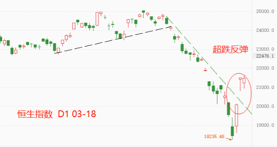 V型反转的概率不高:恒生指数已经连续反弹三日,累计涨幅超16%,买入热情高涨。但是,中期趋势依旧是空头,且已经持续一个多月时间,两天的反弹无法在结构上形成可靠底部。从历史经验看,大跌之后衔接大涨的V型反转结构出现的概率不高,反而大跌之后衔接持续底部震荡的概率较大。关键波段不在当下的超跌反弹,而是在于反弹触顶后的再次下跌。如果第二轮下跌没能跌破前期低点18235,则底部结构形成。底部形成之后,极有可能在当下上涨波段的高点和18235之间形成震荡中枢。核心逻辑是,港股市场的利空已经基本出清,但是利多消息不够密集,所以不具备V型反转的消息面基础。