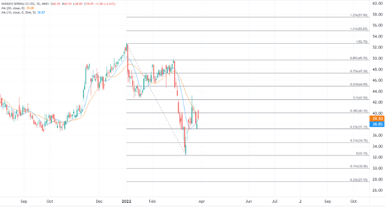 去年农夫山泉股价经历大起大落之后,距离2021年初的历史高位已经跌去逾40%,不过在同业中农夫山泉的估值依然偏高。一个月前成功“染蓝”又恰逢大市波动,直至本月中旬股价才从2020年9月以来的底部回升。