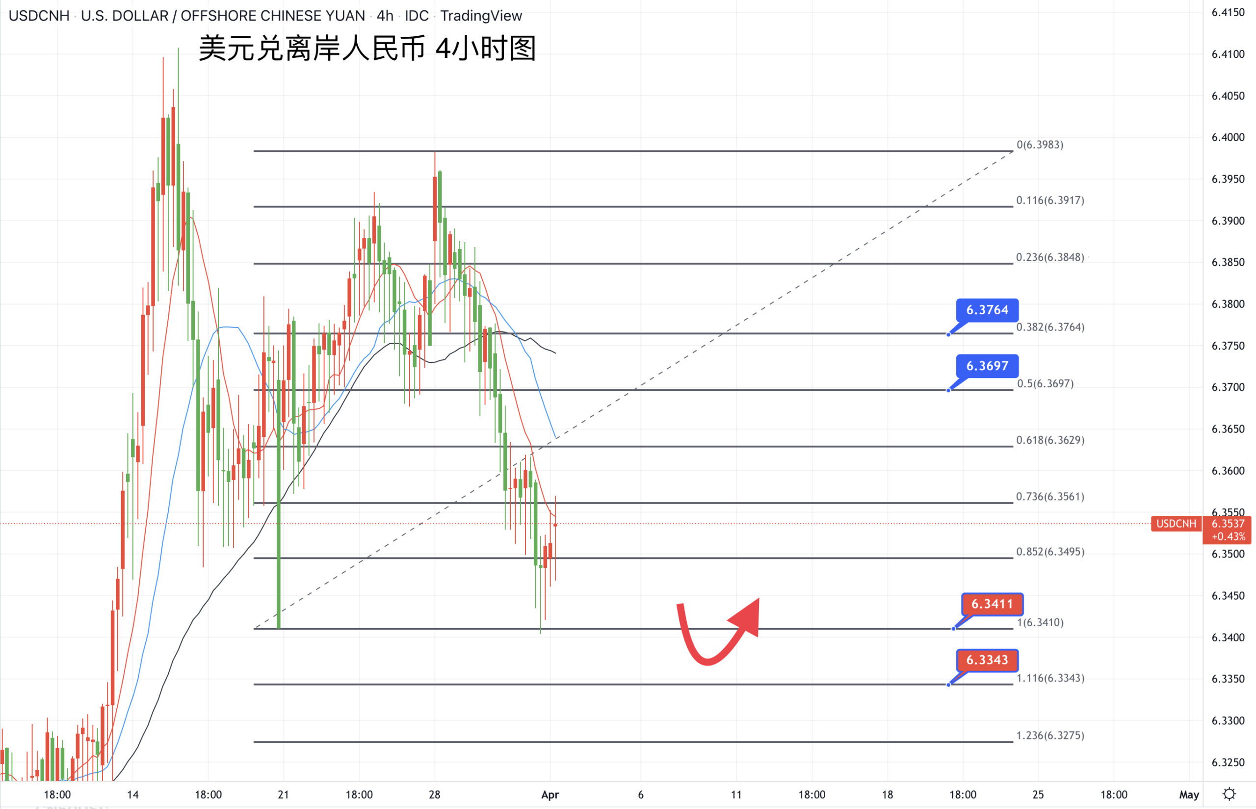 美元兑人民币本周呈现单边走低的趋势,昨日进一步跌至3月11日以来的最低位,20日均线在6.36关口转为了阻力,意味着汇价技术上仍有下探的空间,届时看6.3466/6.3412支撑。