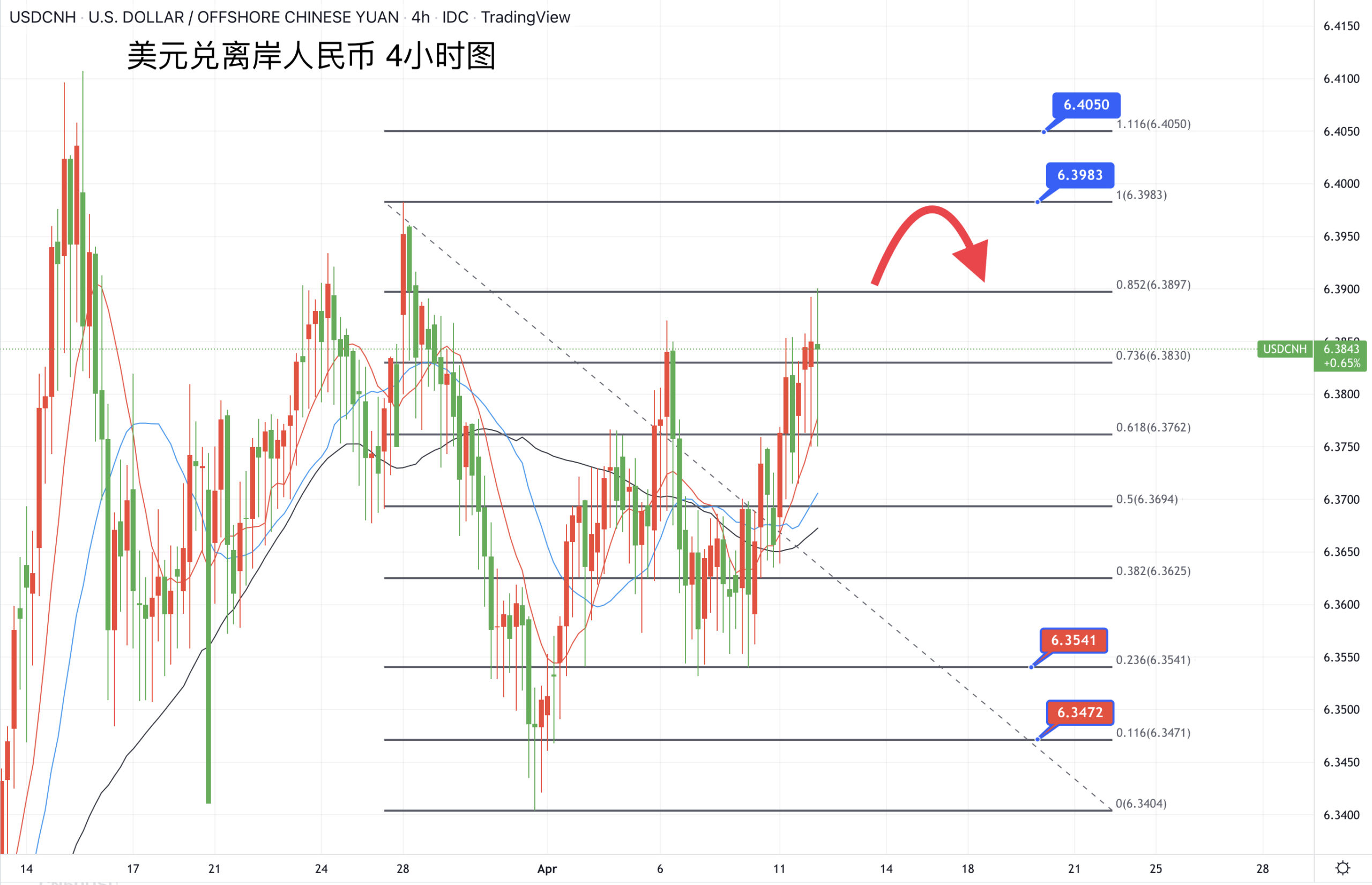 美元兑人民币昨日表现较为强势,录得3月14日以来的最大单日涨幅,收高于6.38,也是3月底以来首次,如果确认突破自3月以来的下行趋势线阻力,那么下一目标看向6.39上方。