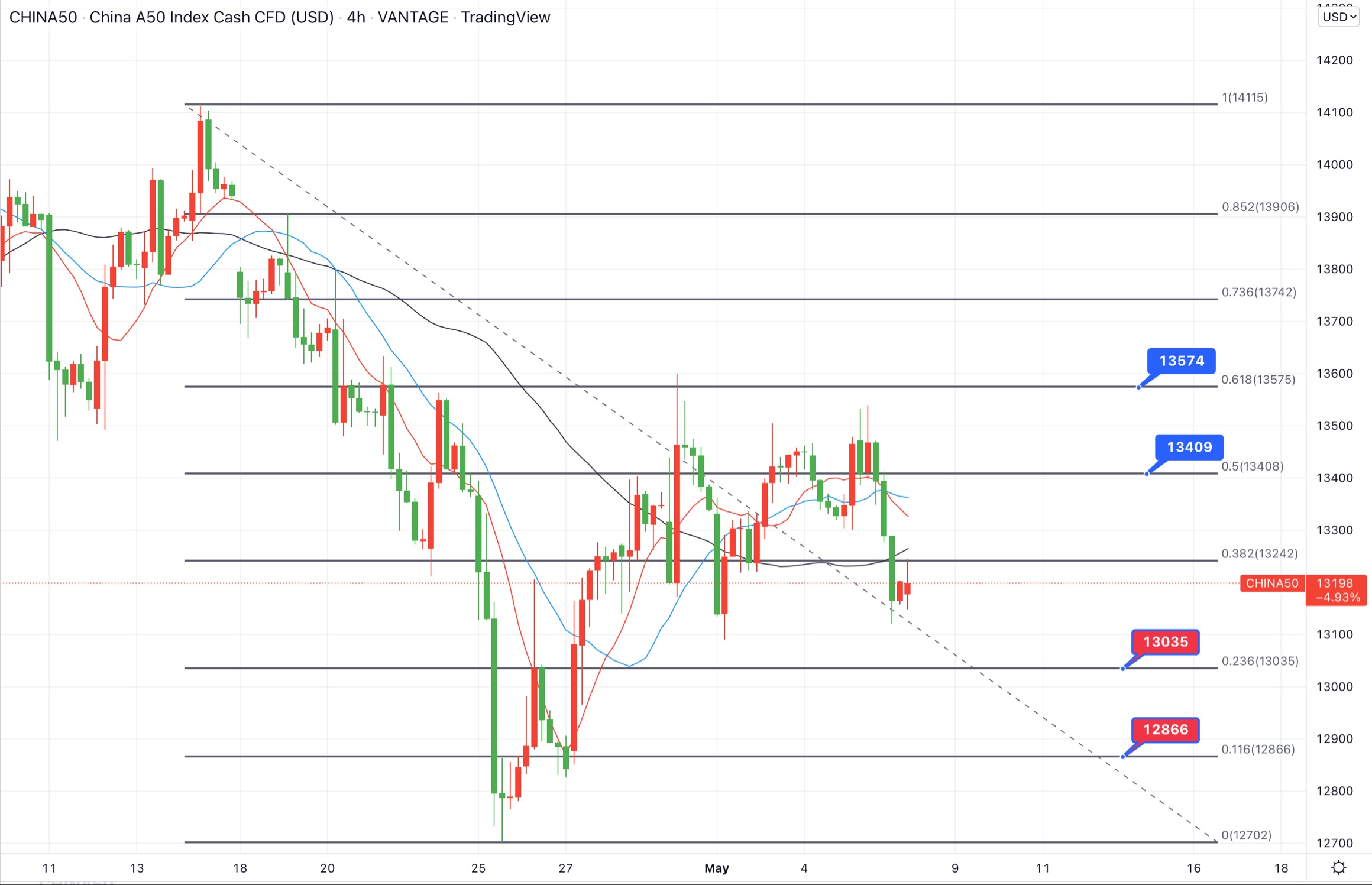 A50指数昨日录得逾一周的最大单日跌幅,隔夜中概股普遍承压,预计可能影响日内交投情绪,昨日下破了10日均线支撑,今早在其下方承压,所以应留意向13000关口靠近的可能。