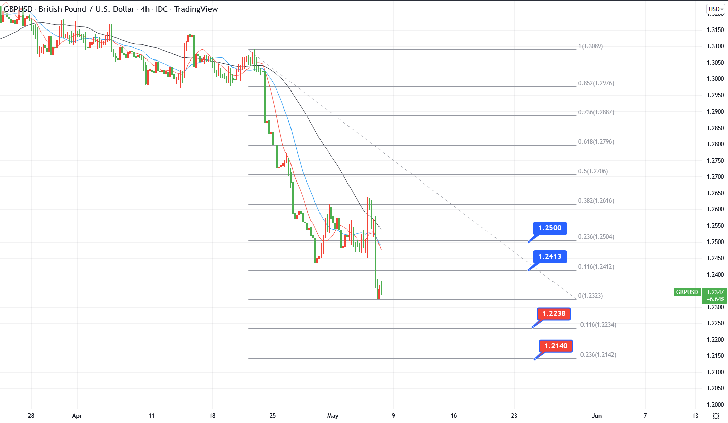 英国央行再加息25个基点至1%,为2009年2月以来最高水平,但同时警告经济衰退和通胀超10%的风险,拖累英镑大跌逾2%,直接触及2020年6月以来的最低位,如果汇价下破1.23关口那么留意当时的低位在1.2240附近可能充当支撑。