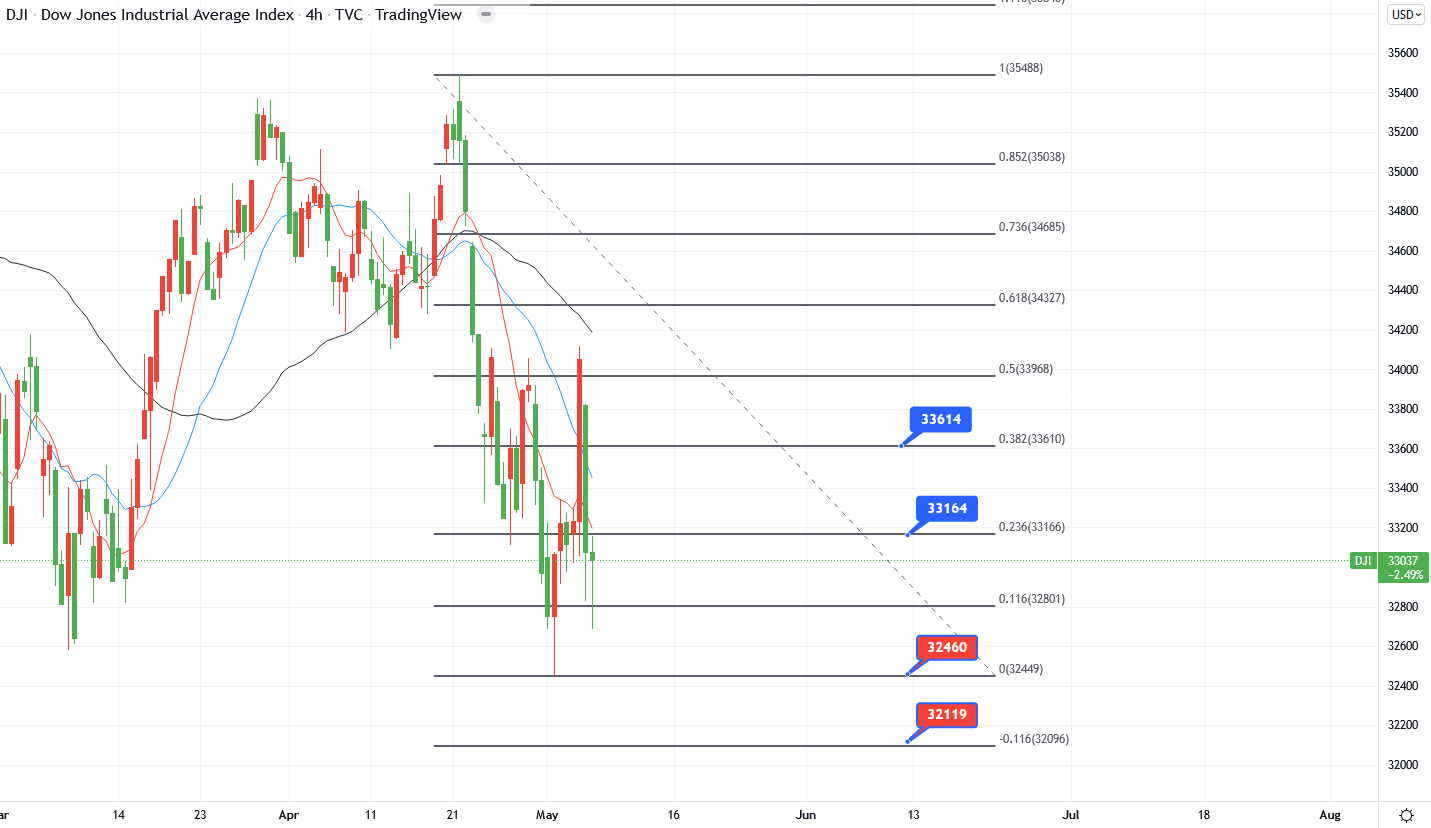 道指隔夜大跌逾千点,道指盘中一度狂泻近1400点,创2020年10月以来最差的单日表现,目前维持在33000关口上方,隔夜大跌后短线有望持稳,先看10均线在33200附近阻力,关注今晚非农报告提供更多指引。