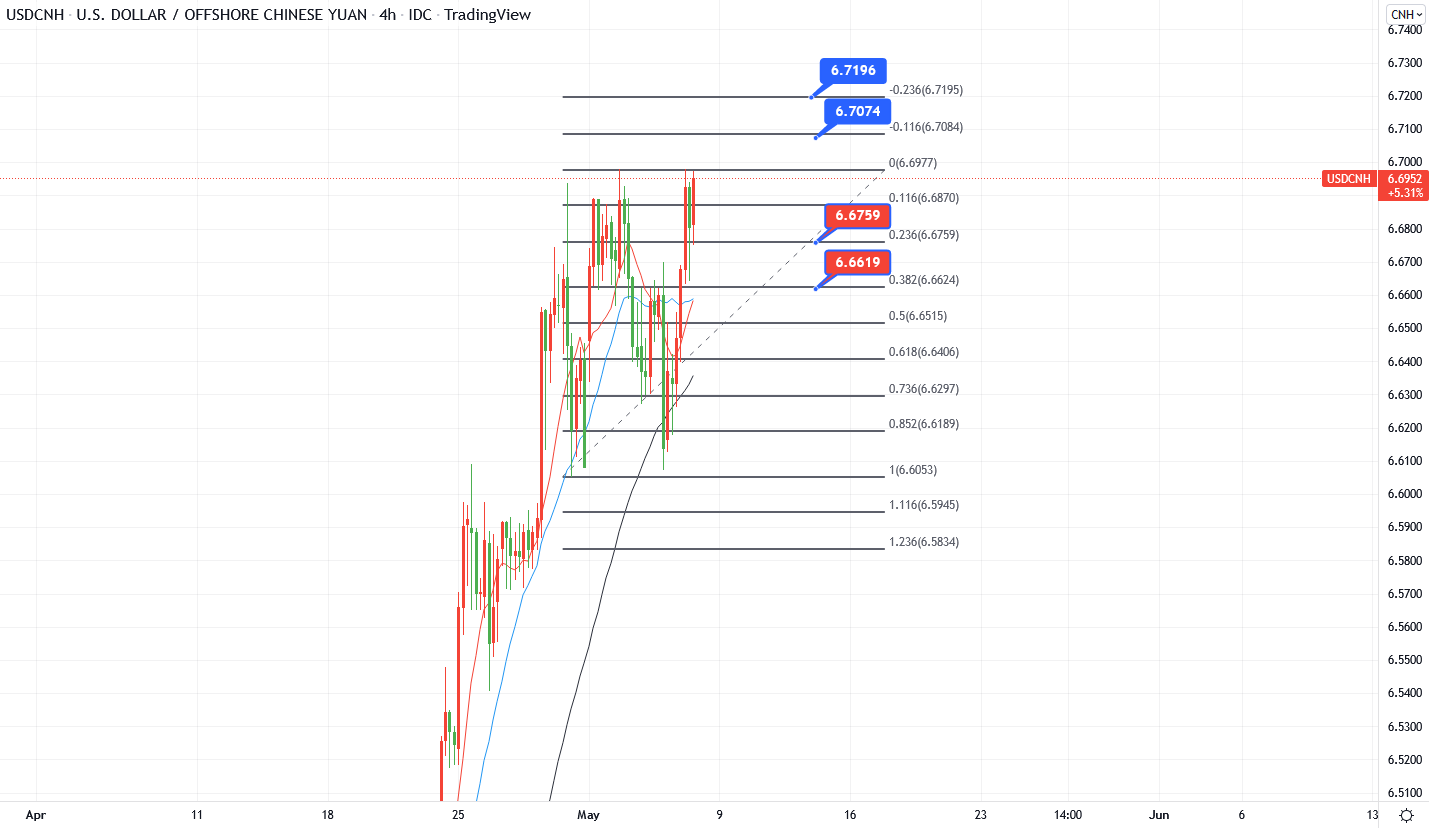 美元兑人民币昨日在测近期高位,留意6.6977自本周以来一直是关键阻力所在,如果突破意味着新一轮上行空间被打开指向6.70上方,但如果持续遇阻,则留意回调压力是否指向6.66水平。