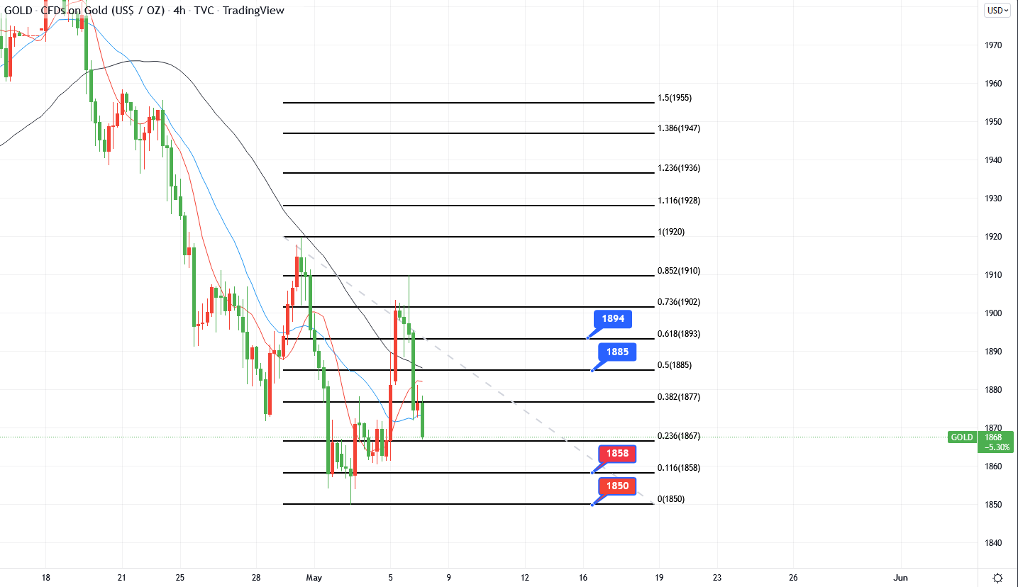 金价昨日冲高后回落,原本重返1900美元上方但未能守住,技术上测试10日均线上方也未能突破,所以仍需关注是否继续下望1860美元附近支撑的可能,不过也留意今晚非农公布是否带来避险资金需求。