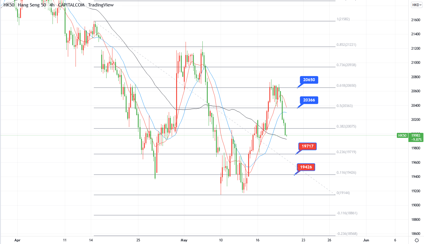 HK50昨日录得四个交易日来的首次回落,技术上同样在本周高位遇阻,20700上方为主要阻力,4小时图显示在顶部盘整之后向下,预计日内可能会在20000点关口附近盘整为主。