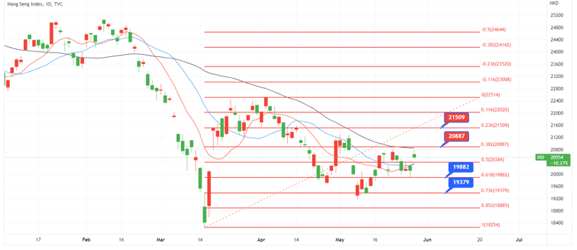 恒指自今年2月份始, 整体下降趋势保持不变。 若恒指走势下行态度不变, 短期阻力仍在20887, 重要阻力在21509。支持位则留意着19882, 19379等支撑位置。