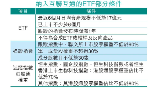 据悉,香港市场ETF过去6个月日均资产规模达17亿元港币,成份证券以港股通标的股票为主,且不含合成ETF、杠杆及反向产品。此次纳入标的的ETF须满足上市6个月、标的指数发布已一年等要求。原则上,纳入标的ETF每半年调整一次。