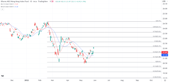 在港股热门ETF中,iShares MSCI香港ETF(简称EWH)今日也见大幅高开,达到4月中旬以来的最高,如果互联互通相关利好持续跟进并最终如期落实,预计可以指向23上方的前期高位。