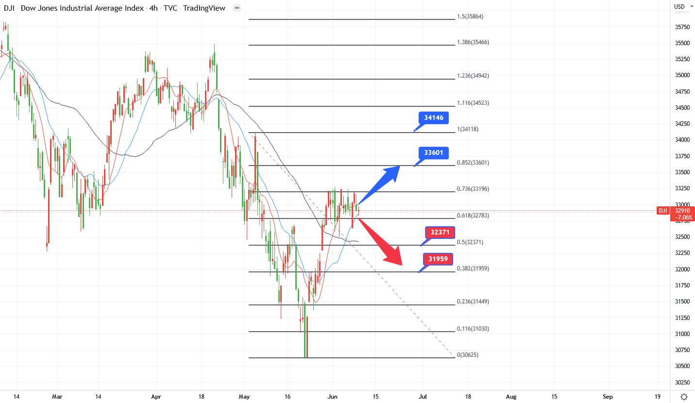 基于对经济前景和通胀上升的担忧,美股止步两连涨,道指期货回吐前日涨幅后回到33000关口下方。技术上4小时图在33196的顶部信号明确,在明晚通胀公布前仍需留意继续调整的空间。
