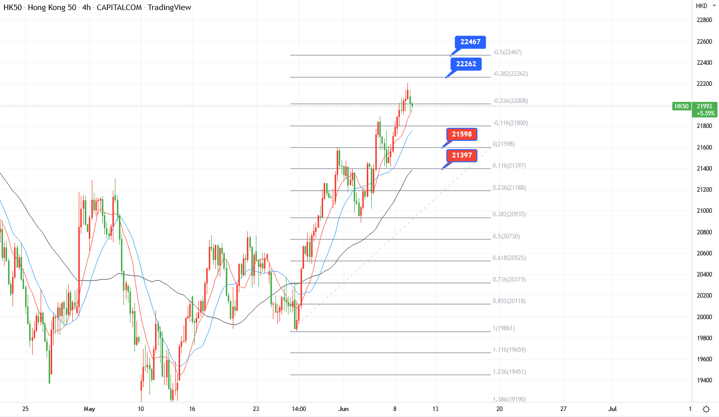 HK50当前则交投在4月7日以来的高位,只是4小时图也发出短线调整信号,高位正好在22200处,所以看是否也跟随A50指数有调整,转为关注10均线的支撑。