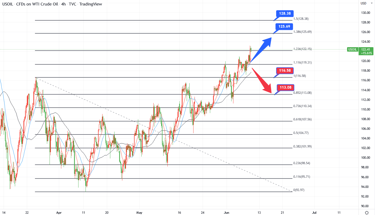 市场对于需求前景保持乐观,国际油价继续上扬再探13周高位,昨日收高于122美元,不过今早自高位小幅调整,4小时图显示初步阻力在123美元上方,所以留意如果短线有调整可能重新指向120美元下方。