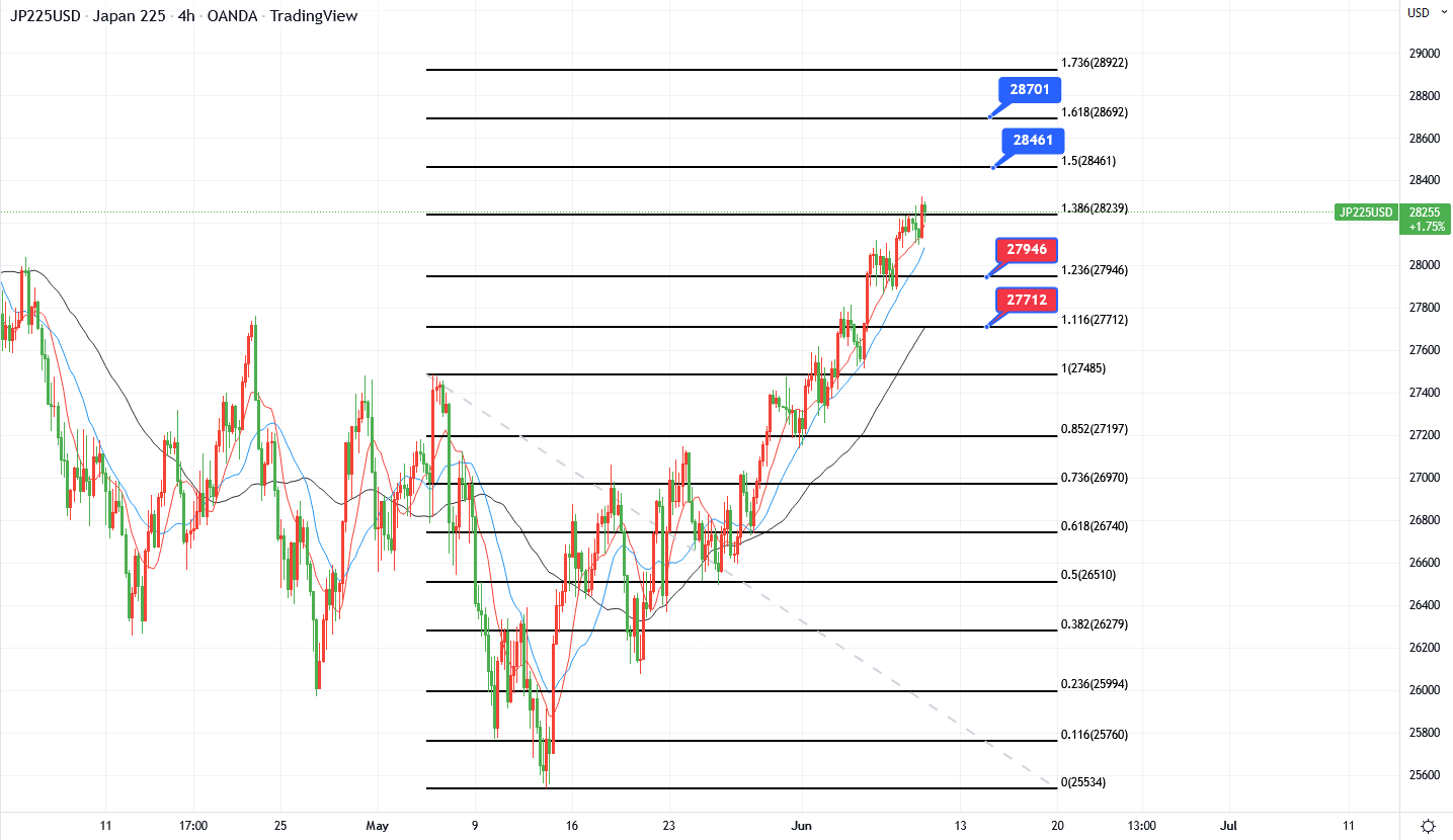 日经225指数昨日稍作调整后,今早继续向3月底以来的高位发起测试,只是今早测试28300上方后动能暂时放缓,表明越靠近前高范围,越可能感受到压力,但如果调整可以现在4小时图均线处寻支撑。
