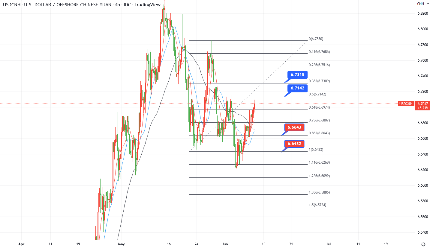 经过连续四日的反弹后,美元兑人民币4小时图自低位的反弹通道保持完好,突破6.70后今早继续上试五日高位,当前留意的是前期高位阻力在6.7140附近,如果可以继续突破将指向6.73关口上方。