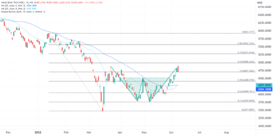 ATFX分析,恒生科技指数已较3月中旬低点上涨近40%,但仍较2021年高点低逾50%,上述的政策面有望继续提供信心支持。技术面看,日内正好触及3月23日高位之后转跌,表明本轮反弹继续扩大之前会有调整,4400关口有望提供支撑。上行方面,如果能突破5000点心理关口会是看涨情绪回归的关键。