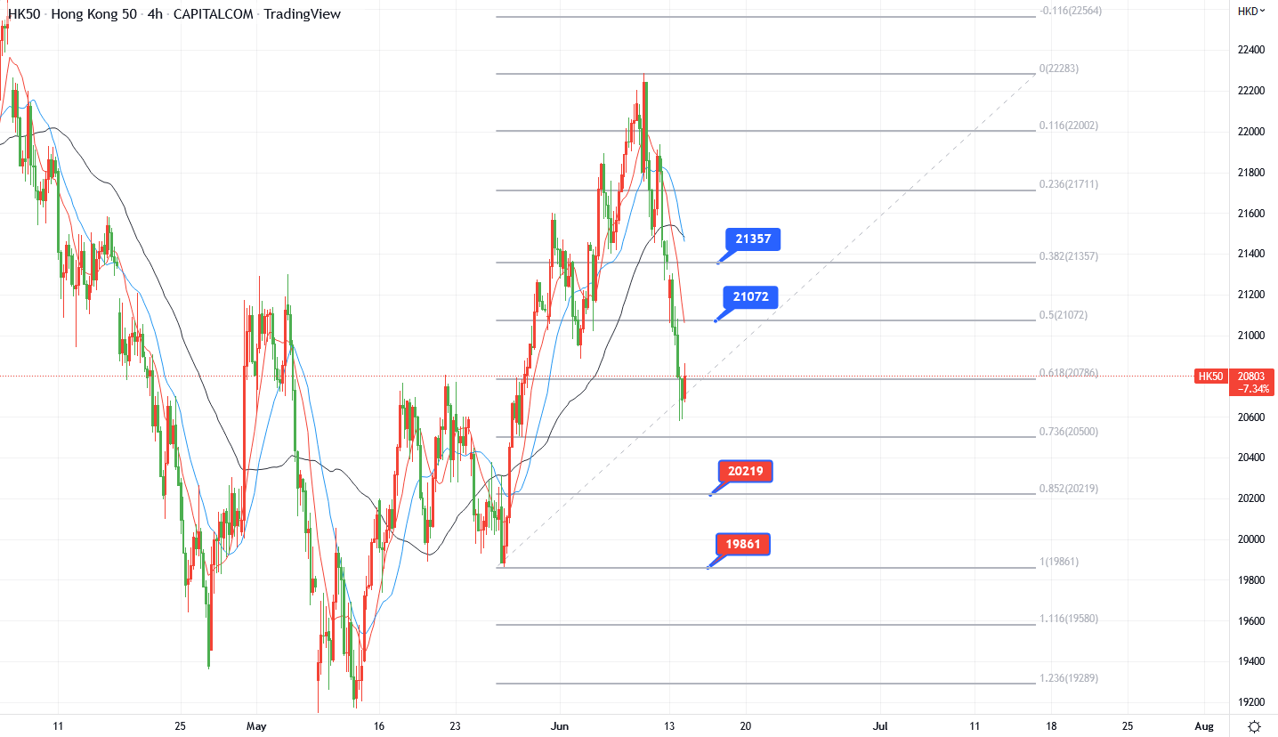 HK50连续收跌,昨日失守21000关口,今早在逾两周低位处徘徊,技术上4小时图在20600处暂时有短线的支撑,但预计外围股市走低会影响反弹情绪,所以仍可能跟随下行看向20500或更低。
