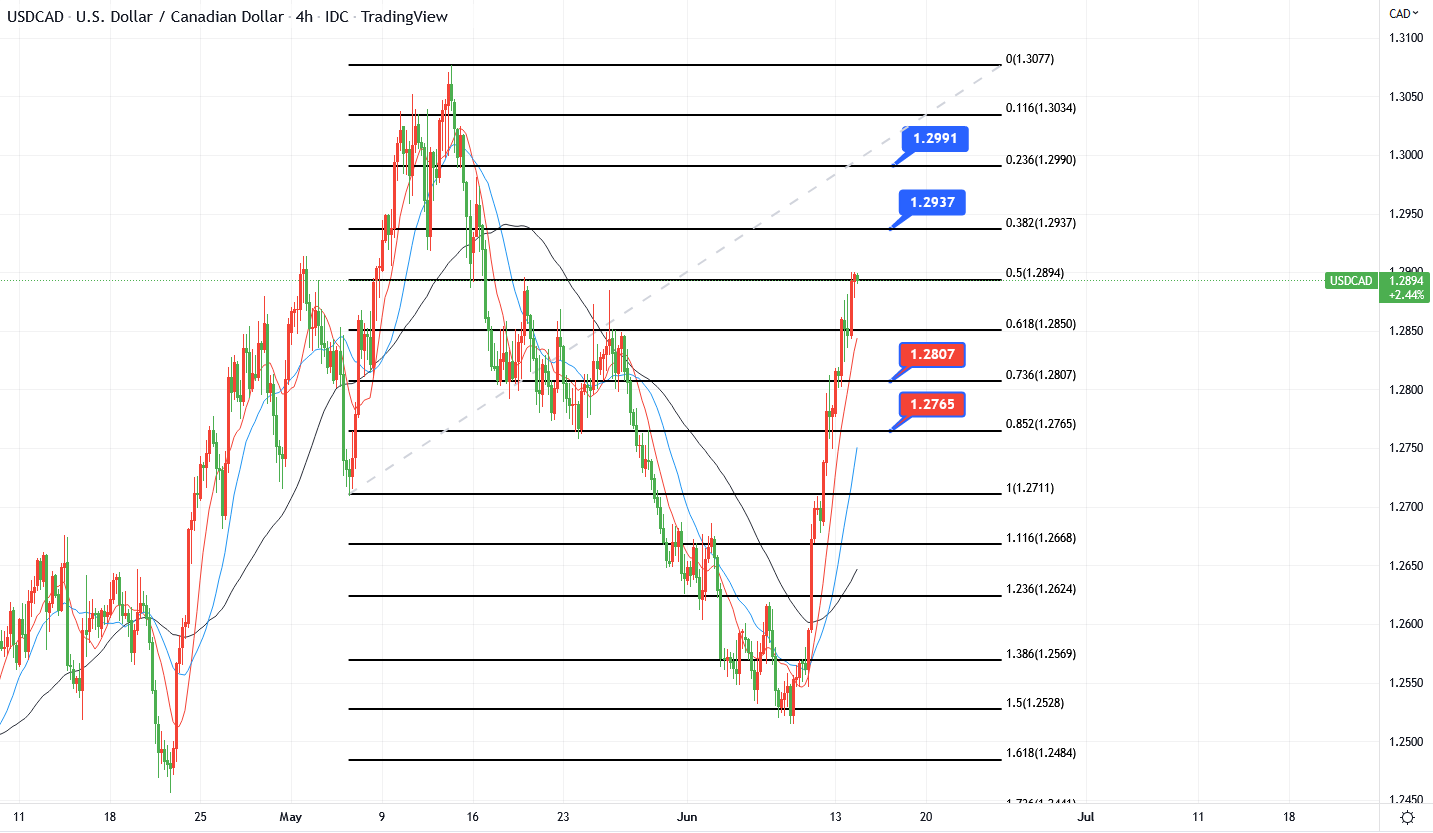 美元兑加元继续跟随美元强势大涨,连续三个交易日收出大阳烛,当前位于5月中旬以来的高位,技术上留意在逼近1.29关口前不排除有短线阻力,如果有调整可能回到1.2850或更低。