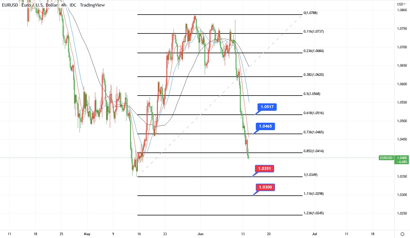 欧元兑美元在美元强势下步步后退,进一步跌至一个月最低,当前险守1.04关口,不过视线仍未能脱离5月份低点作为更低下探目标,不过短线预计会有整理,看今晚美国公布PPI作进一步指引,看欧元会否向1.03关口靠近。