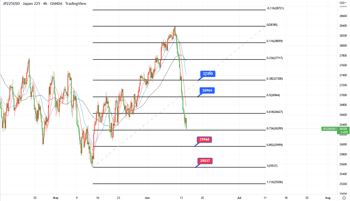 A50指数昨日自近期高位进一步回落,外围股市的利空情绪影响下,今早也小幅低开至五日低位,留意4小时图跌破关键的均线支撑后,可能会向更低的13500关口靠近。