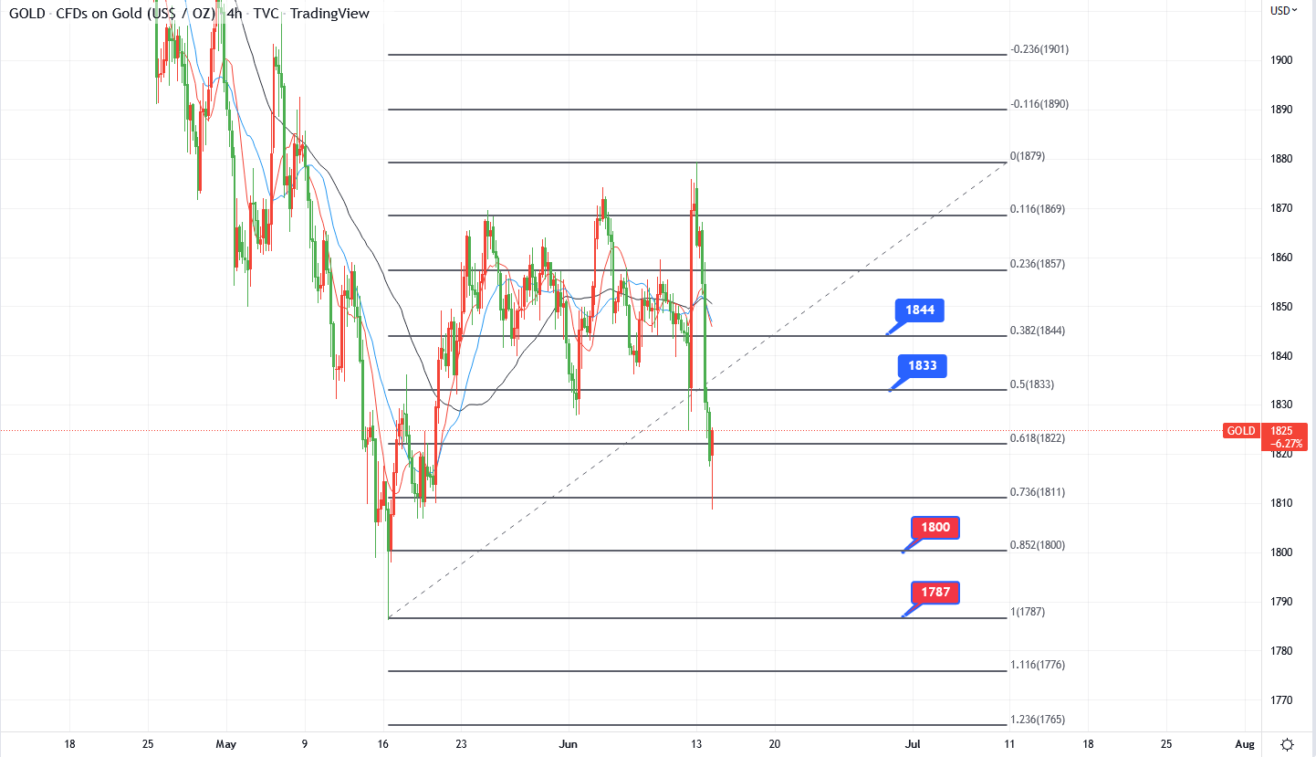 面对美元和美债收益率的强势,金价昨日从5月以来高位直接大挫,创3月份以来的最大跌幅,今早续创5月中旬以来低位之后,在1809美元处暂时获得支撑,而当前市场的避险情绪也可以缓和继续下行的空间。现货白银关注21.47/21.71阻力和20.97/20.73支撑。