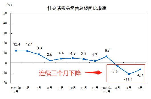 消费是商品循环的最终目的,如果消费不畅,批发、运输、生产等环节均会随之萎缩。自3月份开始,中国社会消费品零售总额同比数据开始跌入负值区间,至今已持续三个月,构成了消费低迷的判定标准。5月份社会消费品零售总额33547亿元,同比下降6.7%,虽然相比4月份有所收窄,但绝对降幅仍偏大。